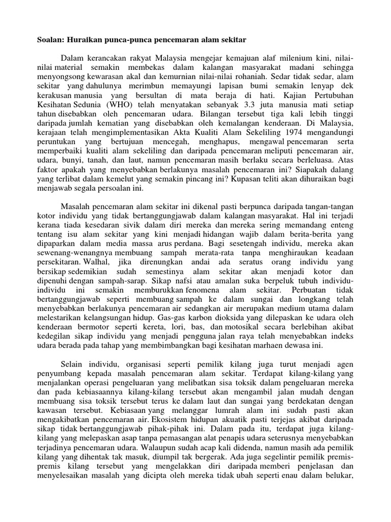 Pencemaran Alam Sekitar Spm Pdf. Di sini saya memberi contoh pelepasan asap kilang dan pembuang sisa toksik ke. Secara keseluruhannya peningkatan kes pencemaran alam sekitar ini memerlukan semua pihak agar berganding bahu duduk semeja mencari kata sepakat sebulat suara dan bersatu hati menangani masalah yang masih tiada kelihatan titik noktah penyelesaian yang mungkin masih jauh perjalanannya.